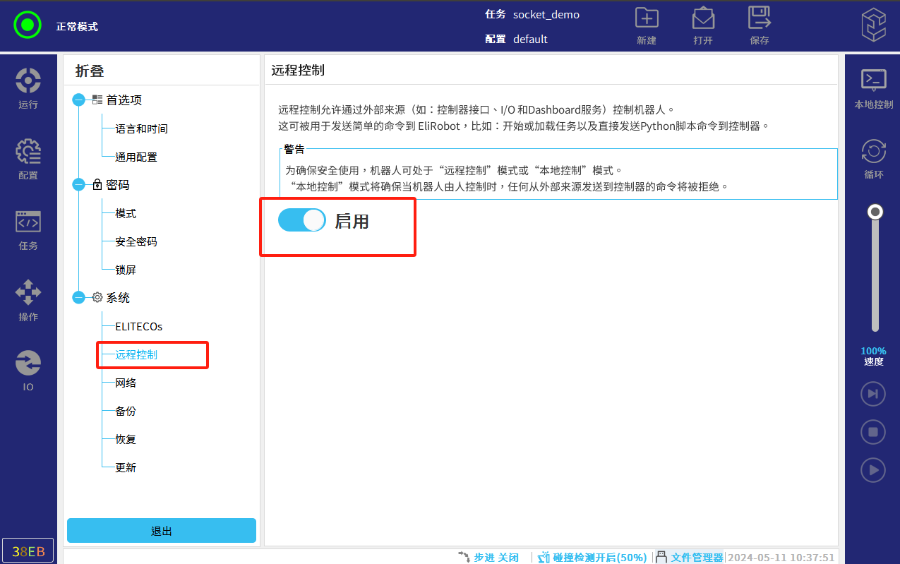 将机器人切换为远程控制模式