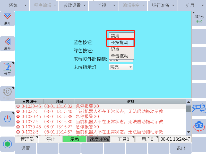 在按末端按钮进行拖动的情况下,如果点击按钮瞬间就拖动就会出现此类报警,我们应
