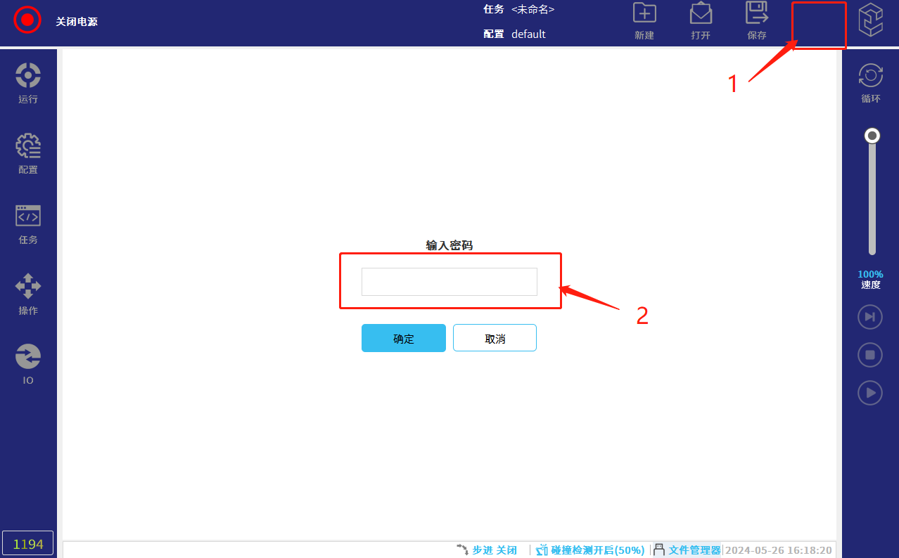 • 在正常模式下点击下图所示右上角红框1标注区域(连续快速点击 5-8 次)就会出现输入密码页面界,红框2点击输入密码:elibot,进入专家模式;