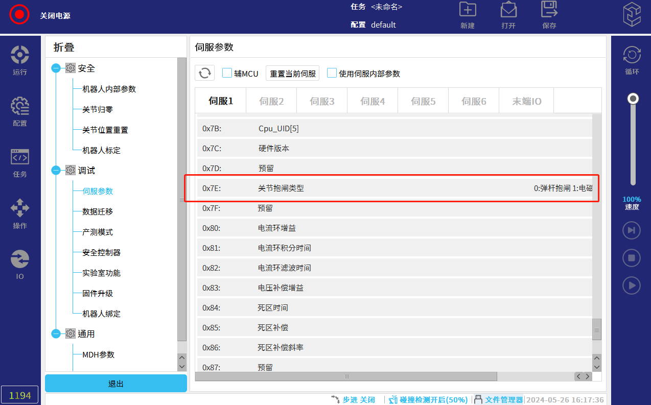• 查看:在伺服参数界面下拉至0X7E位置,查看0X7E的值(0:弹杆抱闸,1:电磁抱闸)