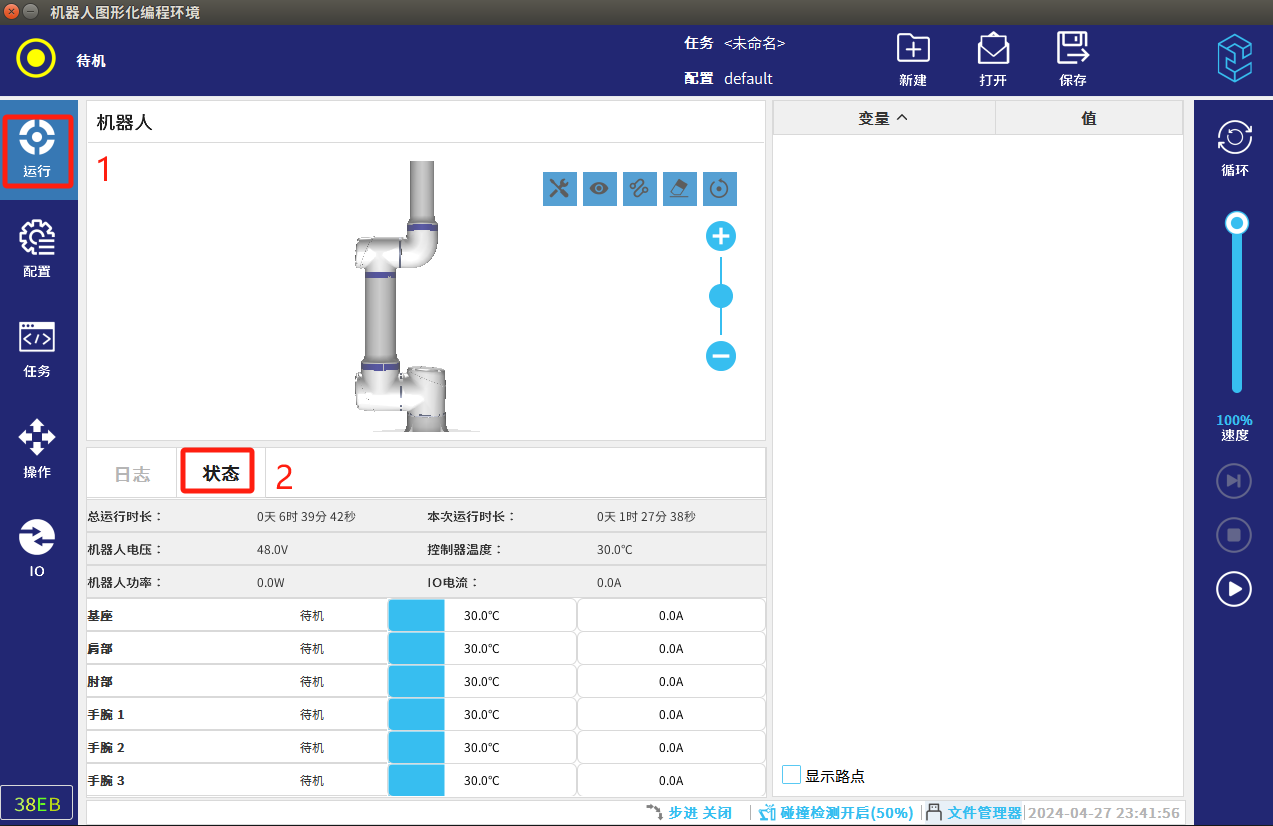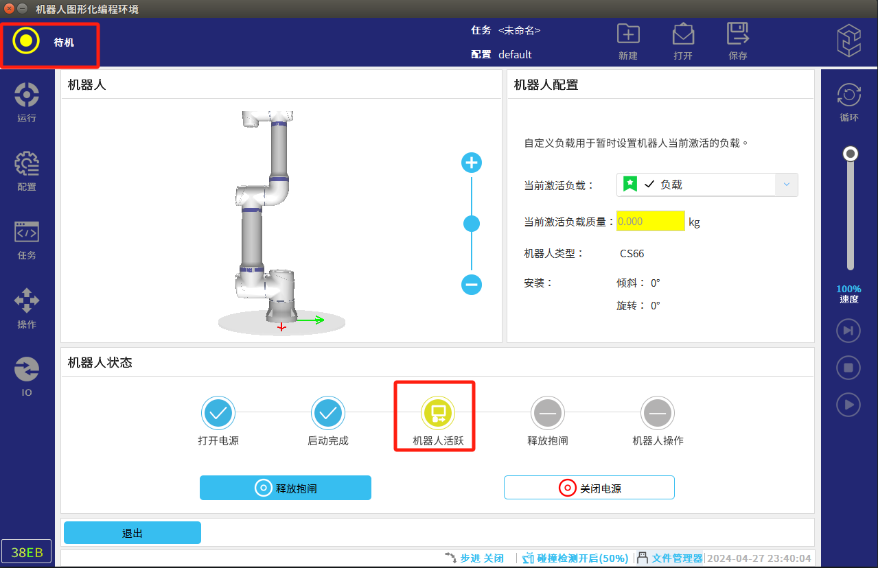 • 机器人显示”待机“状态后退出,进入运行页面,切换状态