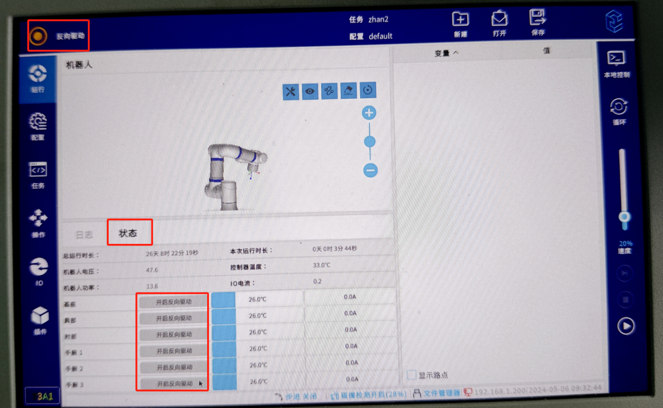 • 按住示教器反面的拖动使能开关,机器人即进入 “反向驱动”模式。点击开启对应轴的”反向驱动“,