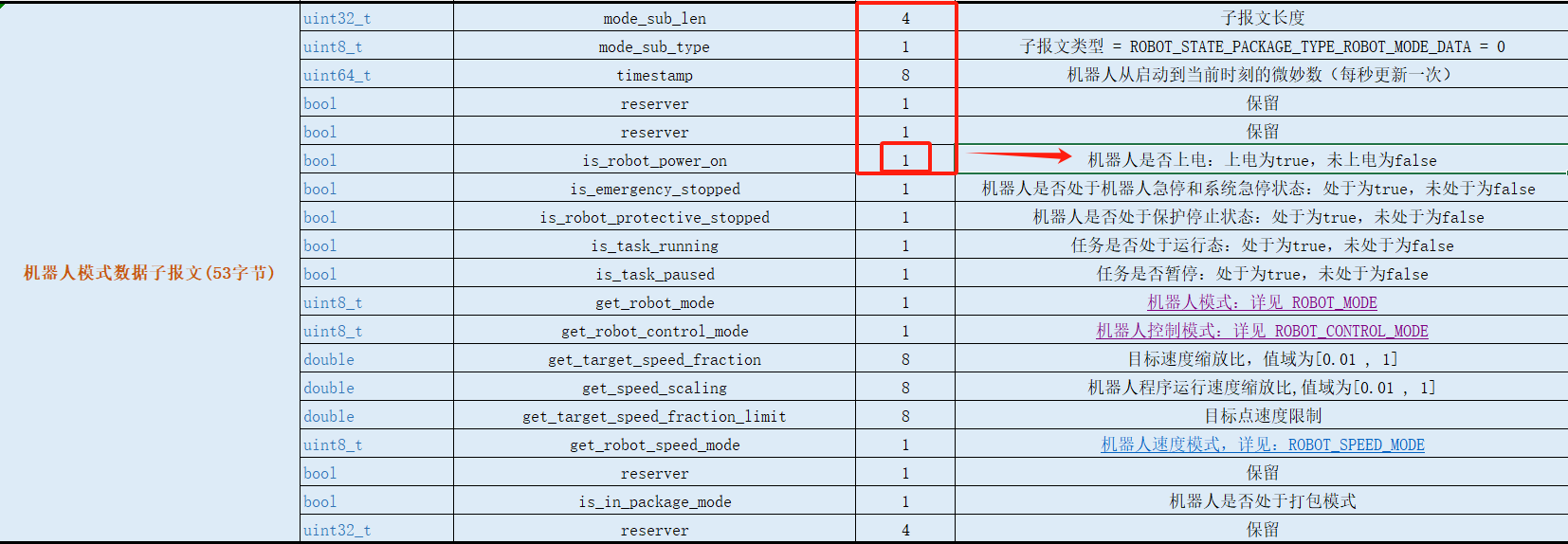 3.解析”机器人是c)“后再次去掉”子报文类型(1个字节)“还剩48个字节=数据C,通过”机器人状态报文表”得知”机器人是否上电“位于”机器人模式”报文中的第16位,由于数据C中已经去掉子报文头(“子报文长度4个字节”和子报文类型1个字节),因此机器人是否上电“位于数据C中的第11位,所以需要把C[10:11]换成成整数后判断是否为1,为1时机器人已上电,为0时机器人已下电;