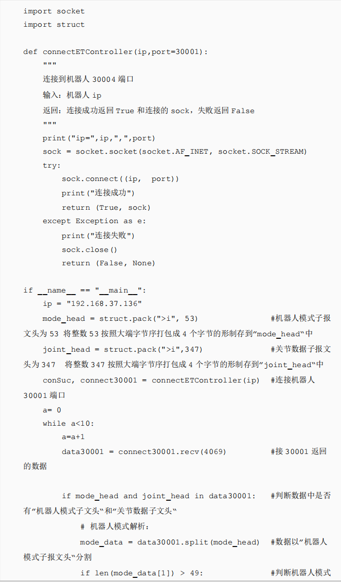 2.连接机器人30001端口后循环接收机器人返回的数据,判断接收的数据中是否有机器人模式子报文头和关节数据子报文头;