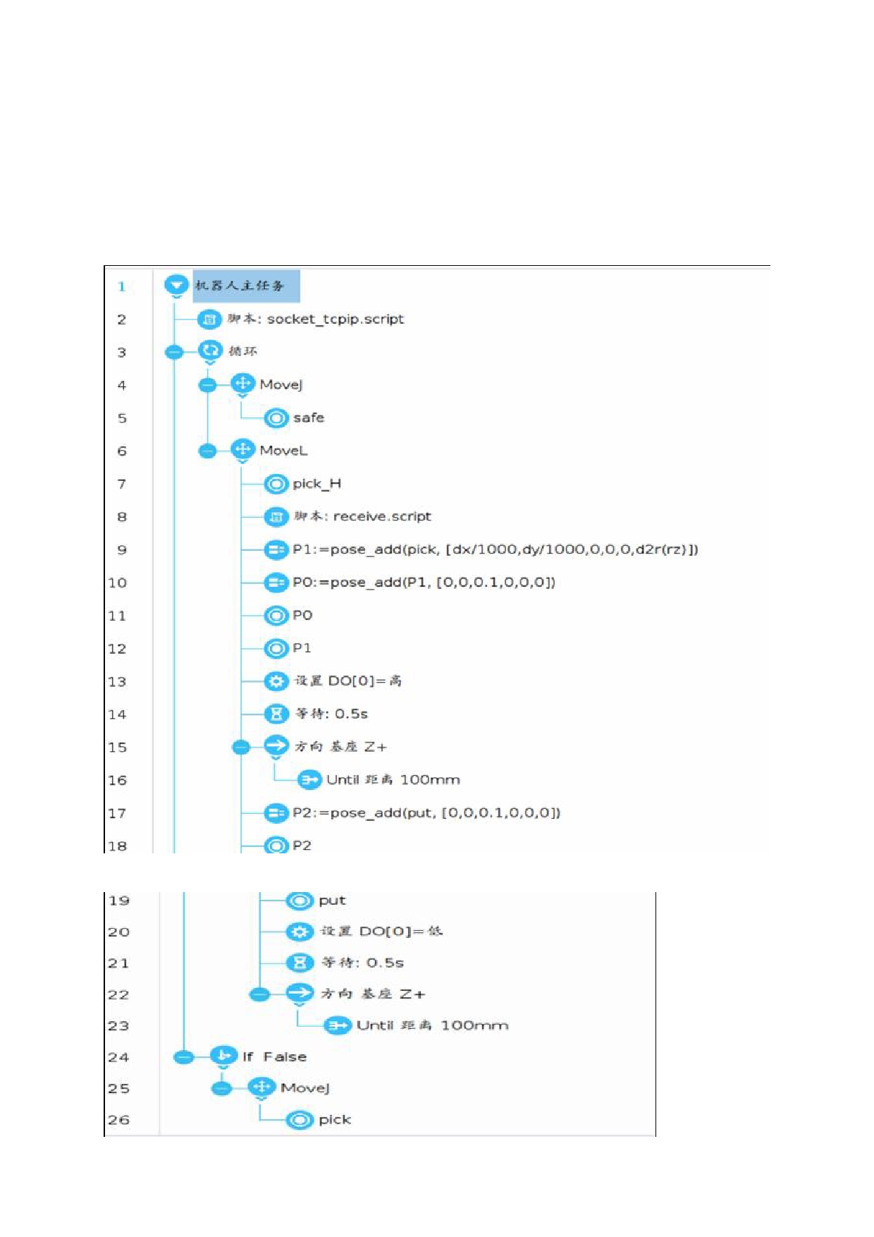 接收视觉坐标脚本程序 receive.script 如下图 6。视觉发过来的数据按照:"OK,1,2,3#"格式,第 1 位数代表标志符,拍照成功发送"OK",拍照失败发送"NG";第 2,3,4 位数分别是 X,Y,RZ 方向的偏移,数据用","隔开,末尾用"#"作为结束符。