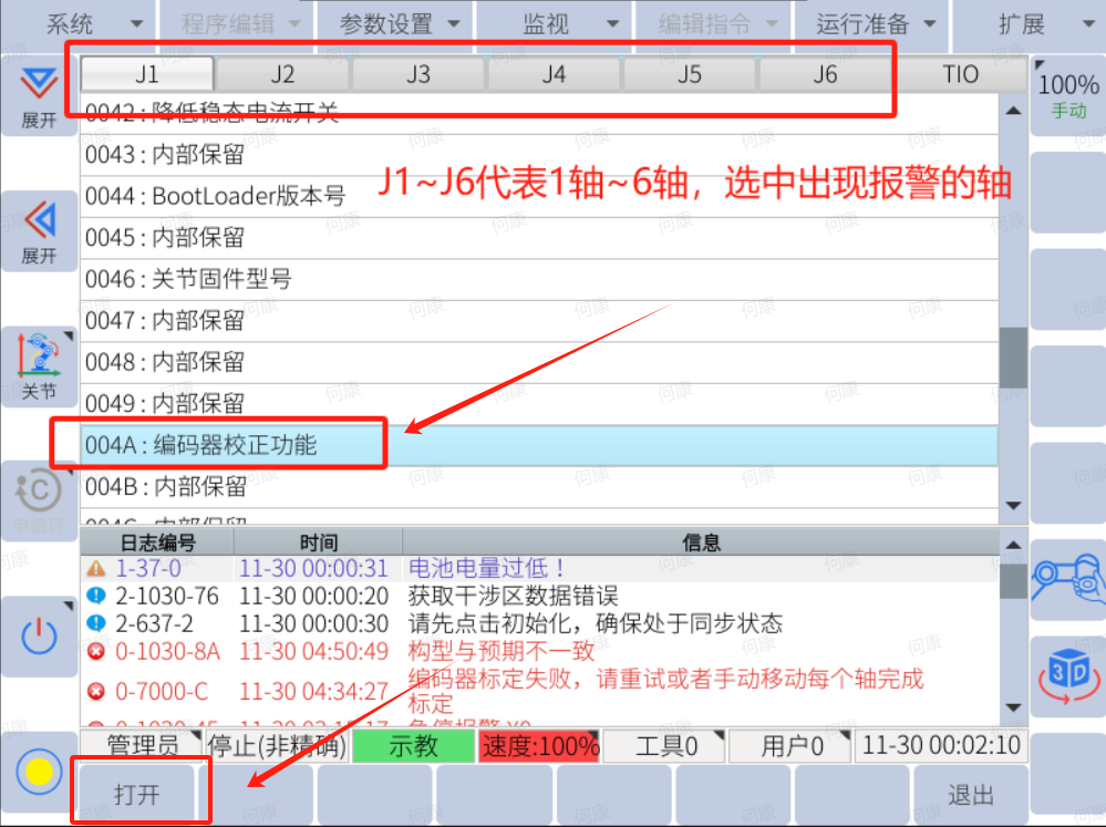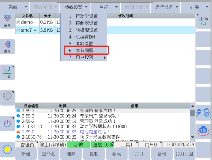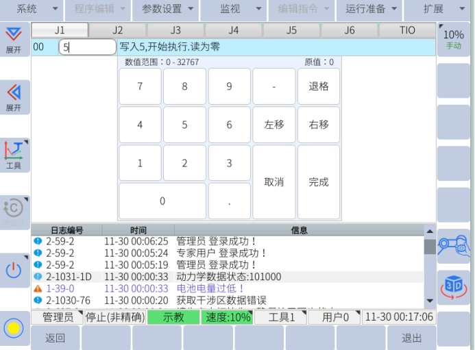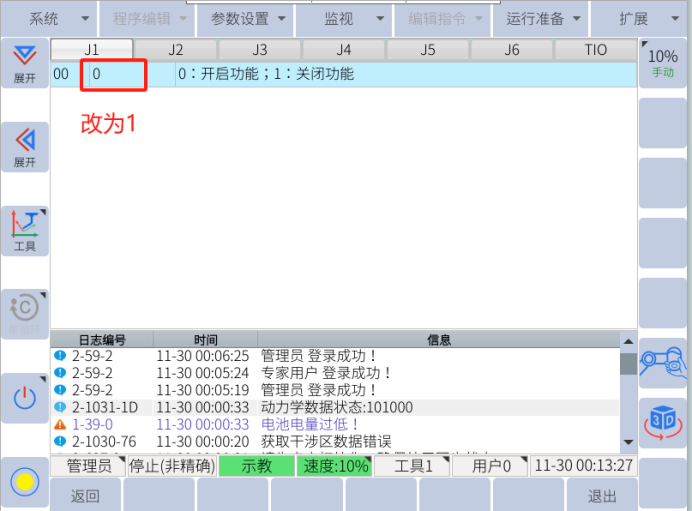 改为5后机器人会提示报警,等待几秒后清除报警,然后断电重启机器人