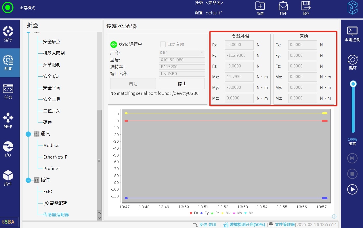 打开力控插件后,需检查一下负载补偿与原始数据,是否正常,如果不正常,需要做力传感器标定。也可以稍微给力传感器外部施加力,检查负载补偿是否有数据,如果没有数据,也是说明不正常。