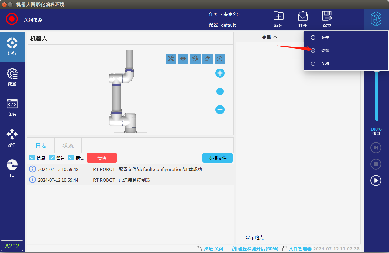 2. 打开机器人软件后,点击右上角星空xklog点击设置。