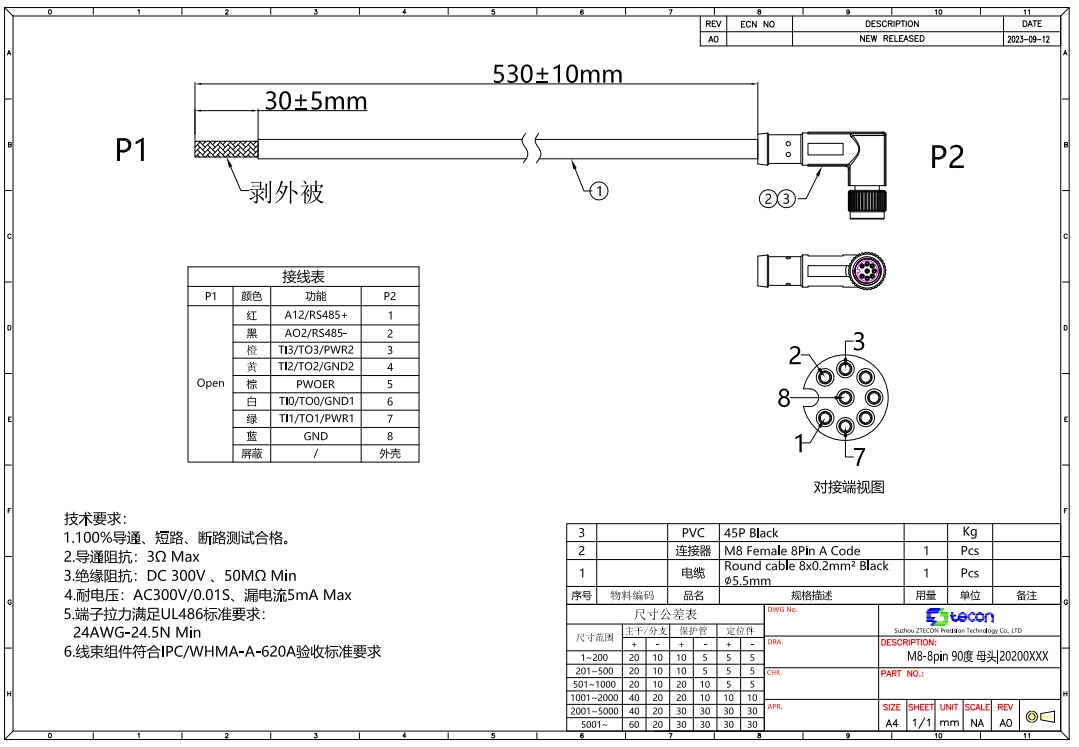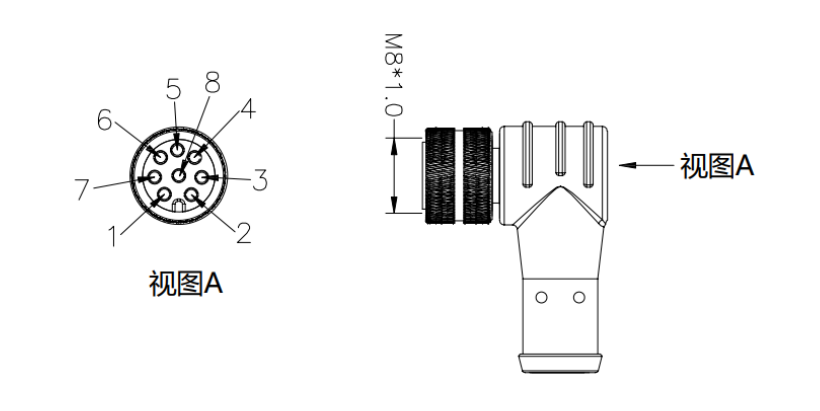 如果是用星空xk提供的8芯弯头成型线,【物料号NA20300180】如图;则针脚编号、线序颜色为固定排序。