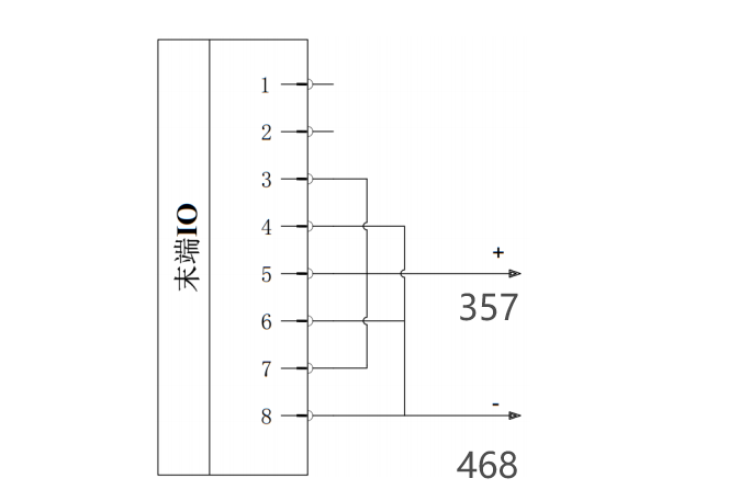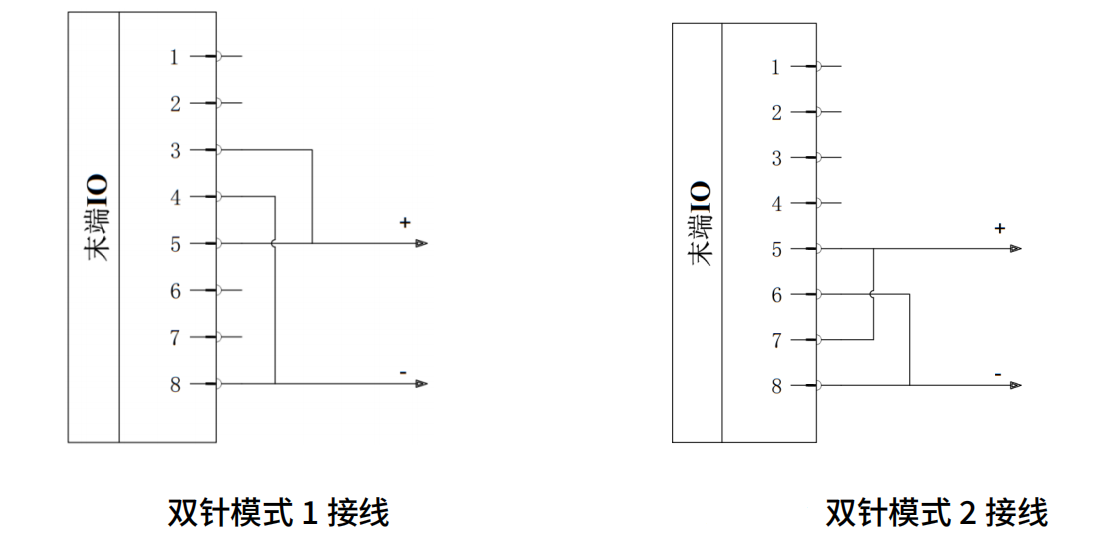 接线方法:如下图双针模式1接线,将电源线(5)与TI3/TO3/PWR2线(3)连接,接地线(8)与 TI2/TO2/GND2线(4)连接。
