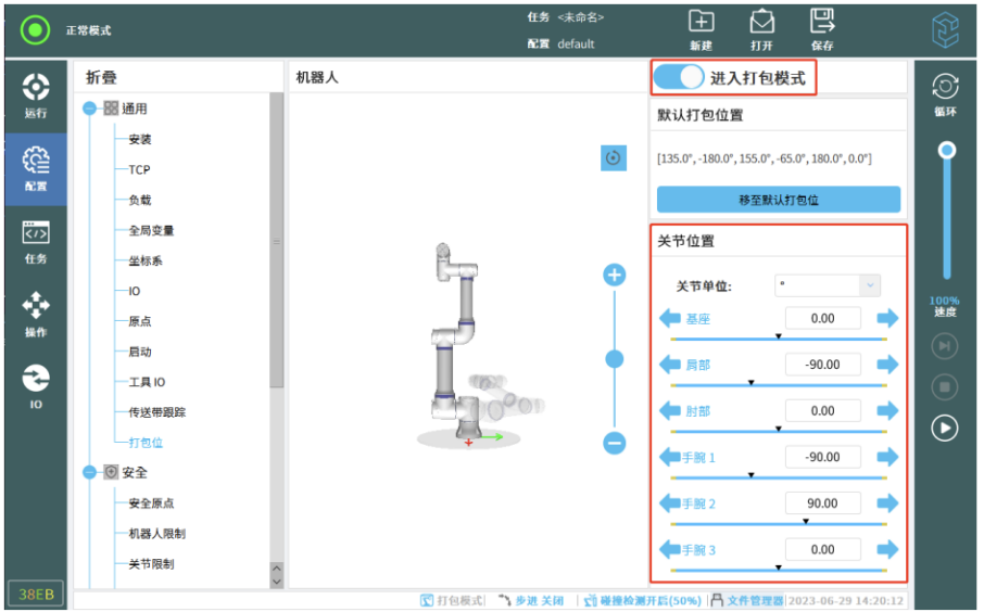 按钮可进入自动移动页面,将机器人移动至打包位置。若用户在当前机器 人配置中设置了安全平面、关节范围等数据,导致打包位置无法到达,可选择“进入打包模式”,在打包模式下,机器人运动范围将不再检测安全平面和关节位置极限,此时机器人可以正常运行至打包位。 离开打包位页面后,系统将自动退出打包模式。