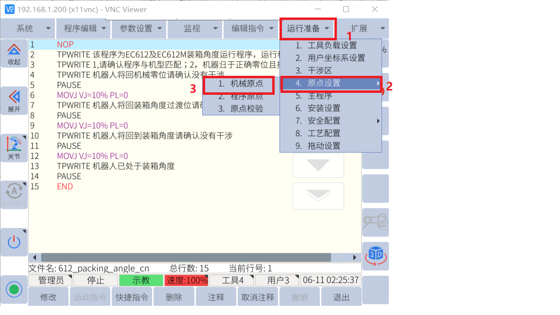 2.程序运行方法或输入包材机型6个轴角度方法回打包位